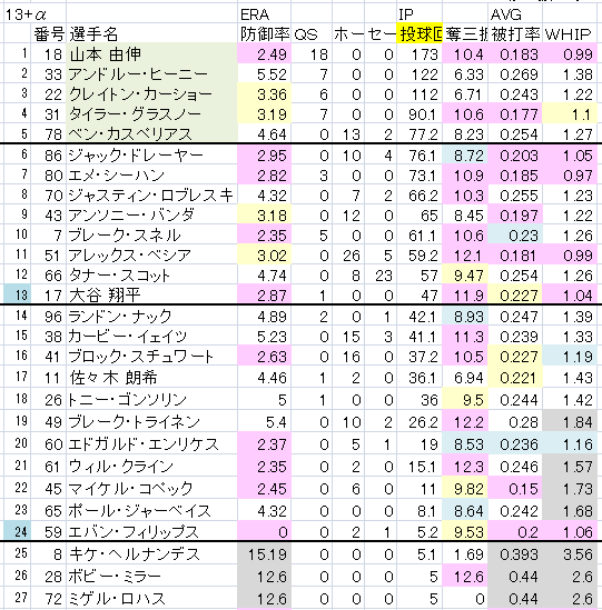 ちなみに、下表に投手成績を示す。 イニング数順。