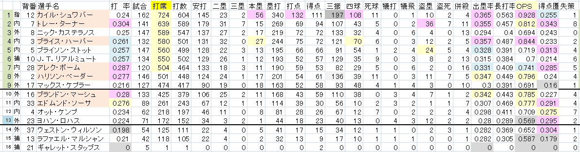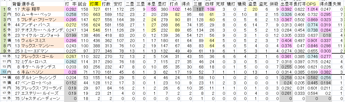 ドジャースとフィリーズの戦力を分析する(野手編) 2025/10/7 未分類 もう始まってしまったけど、ドジャースとフィリーズの戦力を分析したいと思う(野手編)。 まず、ドジャースの今年の選手成績。 クリック拡大。 MLB全体の上位30位以内の値なら、ピンク色、31~60位:黄色、61~90位:青色。 どれかで、ピンク色に成績を出していれば、選手名は柿色。 打席数順に並べている。 率とかよりも、結局それがほぼ成績順を表していると思う。 一方、フィリーズの今年の選手成績。 いや~、大したもんだ。 ドジャースに勝るとも劣らない。 本塁打が少し劣るぐらいかな。