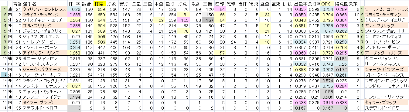 打席数順に並べている。 率とかよりも、結局それがほぼ成績順を表していると思う。