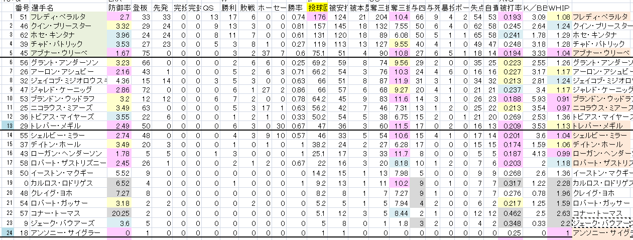 投球回数順に並べている。 率とかよりも、結局それがほぼ成績順を表していると思う。