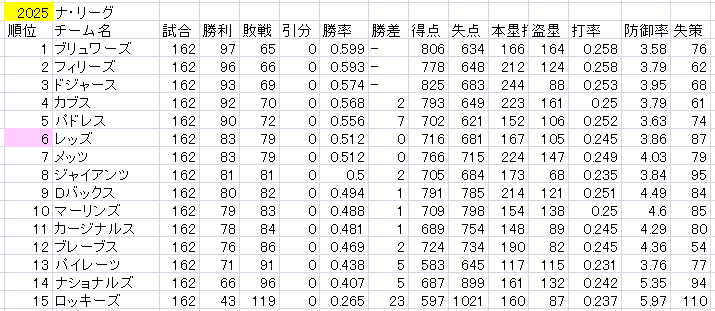 結論付けると、ドジャースの方が投手力を含めた守備力が上で、攻撃力も、ドジャースの方が本塁打が多い分、上と言えよう。