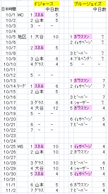 ブルージェイズは、ワイルドカードシリーズがなかった分いいのだが、試合数はドジャースの10試合に対して、11試合になり、逆に多くなってしまって、不利になった。